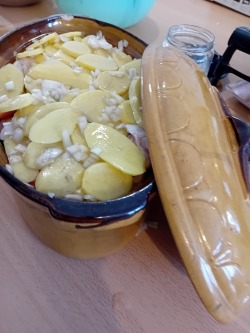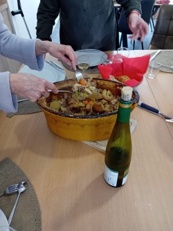 Le plat principal a mobilisé toute l’attention : le Baeckeoffe, spécialité alsacienne emblématique. Ce plat généreux à base de trois viandes (bœuf, porc et agneau) demande du temps et de la précision. La marinade, commencée la veille, permet aux saveurs de se développer pleinement. Le jour J, les ingrédients sont assemblés avec des pommes de terre, des légumes et des aromates, puis cuits lentement à l’étouffée pendant plusieurs heures. Résultat : un plat fondant, parfumé, qui réunit tout le monde autour de la table.