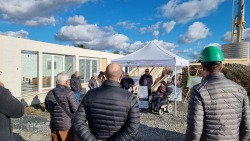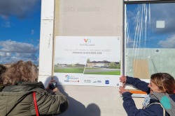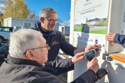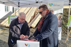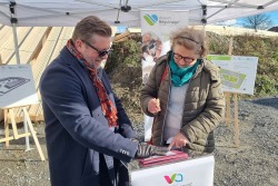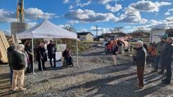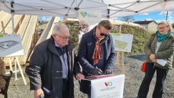 En clin d’œil à ce mode constructif durable et chaleureux, le traditionnel coup de truelle a été remplacé par le vissage d’une plaque commémorative directement sur le mur en bois du futur bâtiment, signe officiel du démarrage du chantier.